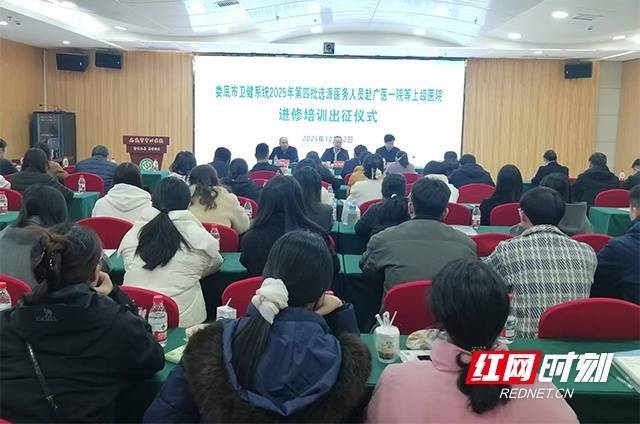 r12月12日,娄底市卫健系统2025年第四批赴广医一院进修培训出征仪式在市中心医院举行,从全市范围内选派的六十名医务人员即将赴广医一院等上级医院进修学习。